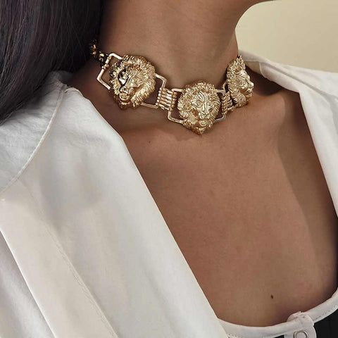 Gå med en stil likt Cleopatra själv, genom att bära ett Guldfärgat Lejonhalsband! Detta Choker-Halsband visar upp fyra stycken Lejonhuvuden, och kommer sticka ut som en kaxigt Smycke!